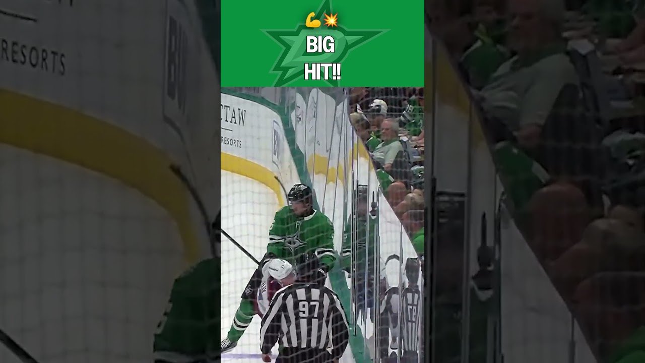 Dallas Stars Lian Bichsel delivers a huge open-ice hit on the Avalanche’s Parker Kelly.